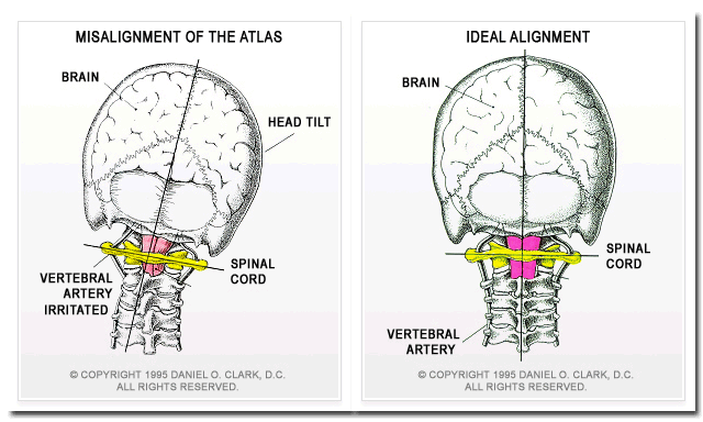 The misalignment of the atlas (the top vertebra of the neck) triggers an abnormal nerve action causing muscle shortening or tension throughout the lower back which often distorts the pelvis.